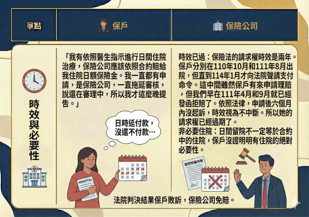 所謂日間留院,是指病患白天在醫院接受治療與復健,晚上返回家中的治療模式。對於保險公司而言,這是否等同於全日住院常有爭議。保險公司常以非必須入住醫院診療為由拒賠。但在法院實務上,若醫生證明有其必要性,可能有爭取空間。然而,在本案例中,讓保戶輸掉官司的並非醫療認定的必要性,而是請求權時效。