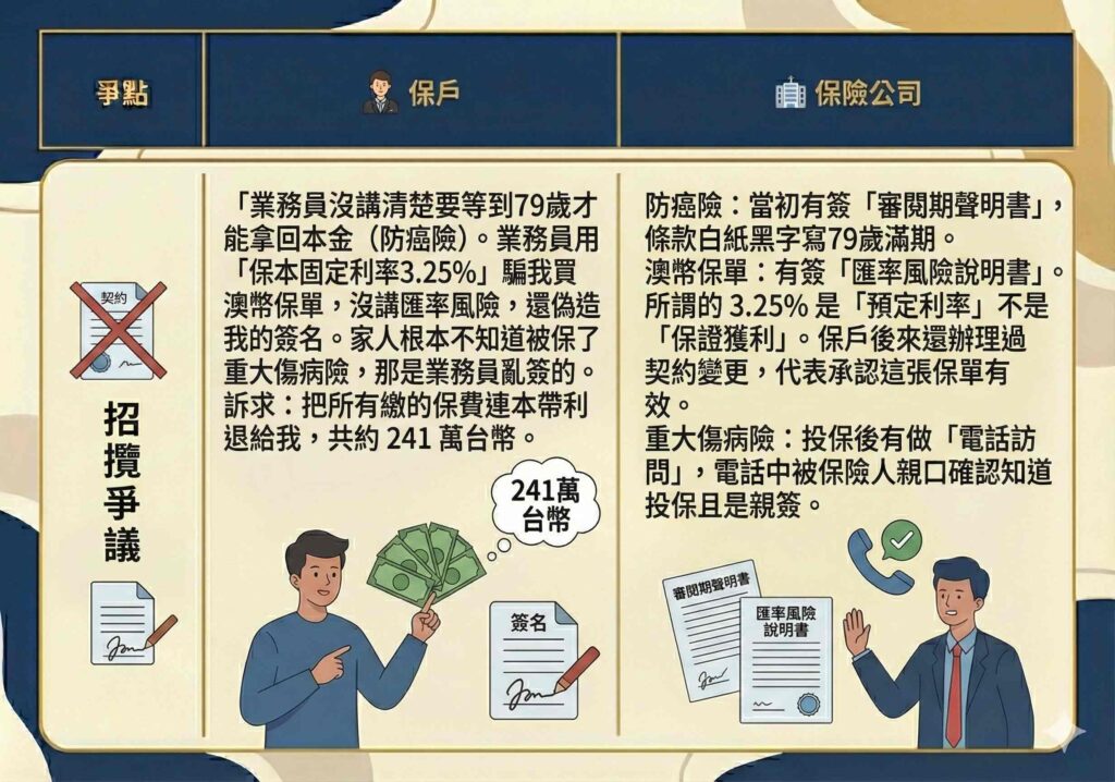 在本案中,保戶指控業務員承諾「澳幣儲蓄險有固定利率 3.25%」,但後來發現並非如此。